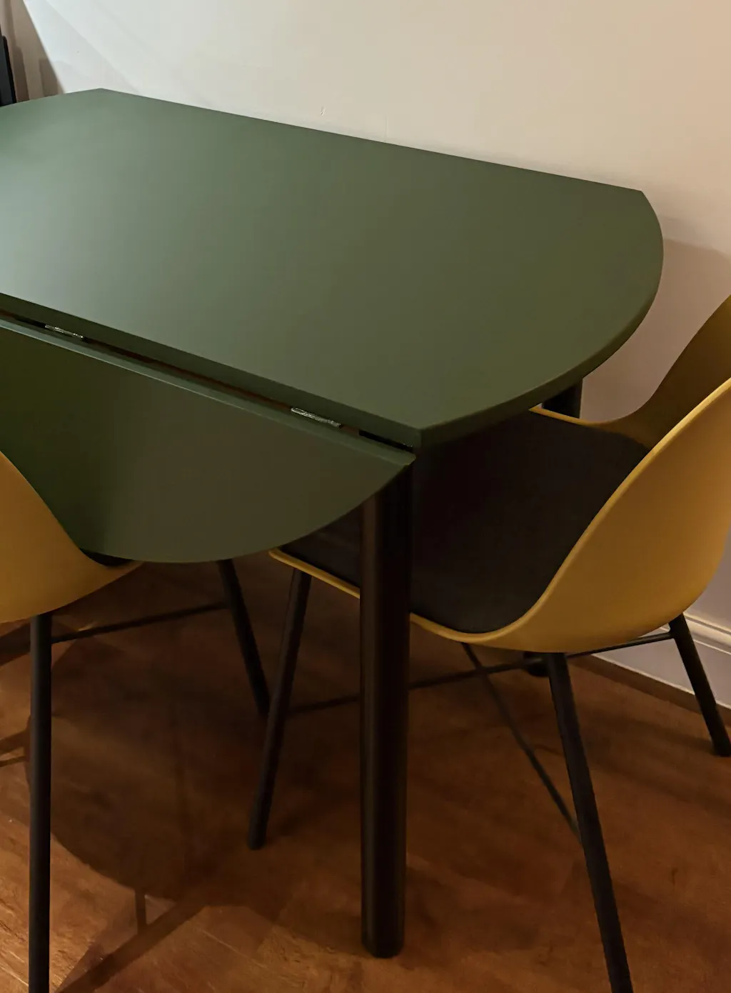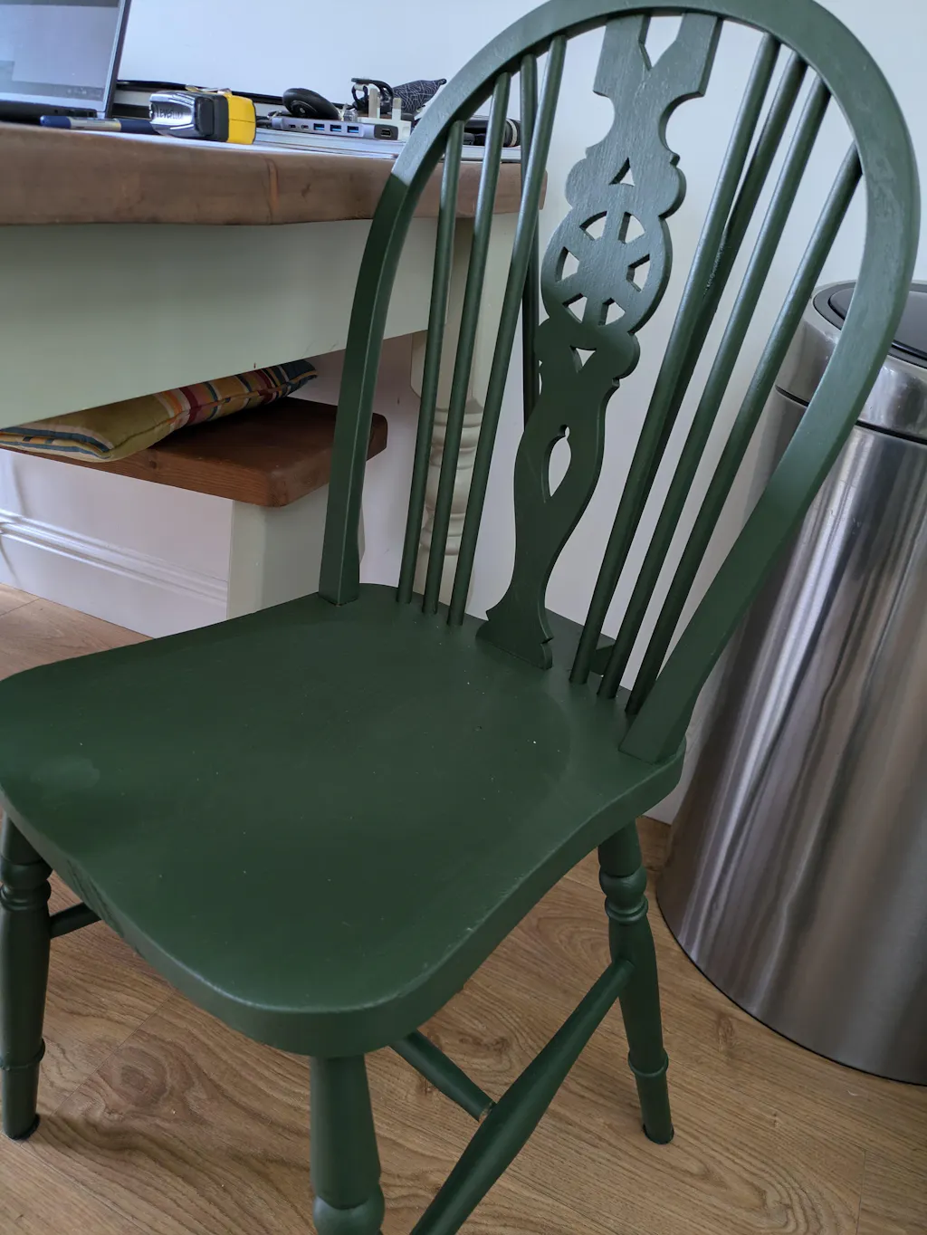 Lovely dark green colour.The paint was easy to apply to my kitchen chairs and dried very smoothly. Would recommend for painting furniture.